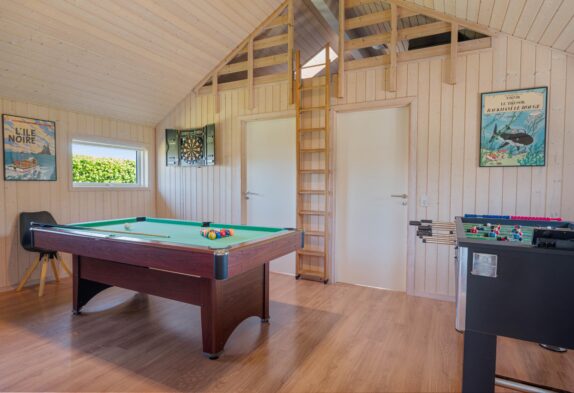 Aktivitetsrummet, som I kan træde ind i fra stuen, byder på billard, dart og bordfodbold – en oplagt mulighed for en mini-turnering. Fra aktivitetsrummet har I adgang til en hems, hvor der er både tv og PlayStation, og hvor børnene kan have deres eget fristed til leg og underholdning.