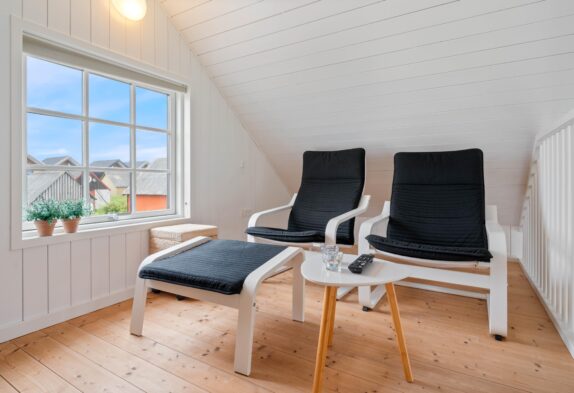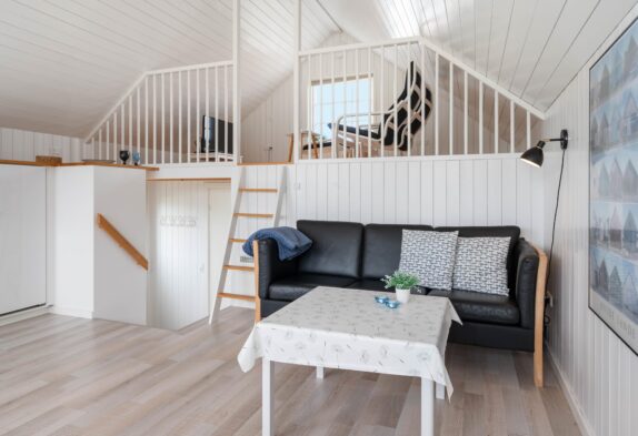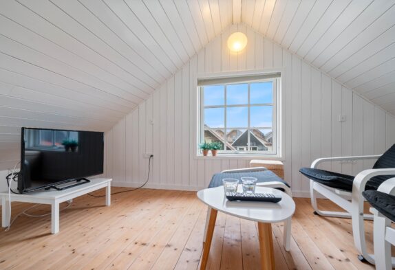 Heroppe er der lagt op til afslapning og tv-hygge i de gode lænestole. Nedenunder er her placeret en sofa – så imens konen snitter i køkkenet, kan du slænge dig i sofaen, skænke vin i glassene eller tænde op i grillen udenfor, på den lille hyggelige træterrasse, som er placeret lige udenfor køkkenet. Herude er der plads til de lange sommeraftener, med den smukke udsigt udover havnen.