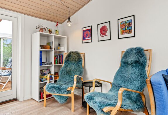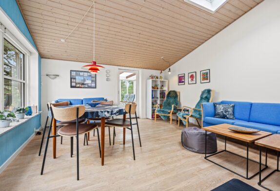 Stuen, som er indrettet i skandinavisk stil, ligger i forbindelse med udestuen. Især i foråret er udestuen et hit – her kan I fange de første solstråler i en behagelig temperatur med kortspil, eftermiddagskaffe og gode grin.