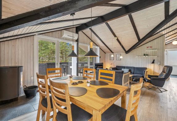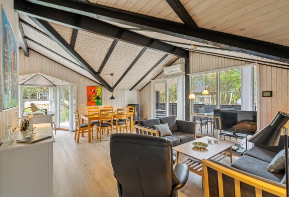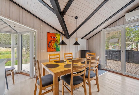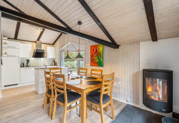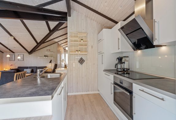 Det veludstyrede køkken ligger i åben forbindelse med stuen og spiseafdelingen og er hyggeligt indrettet med lyse farver og højt til loftet. Her er de perfekte rammer for en ferie med masser af kvalitetstid med de nærmeste.