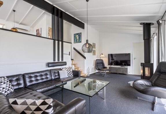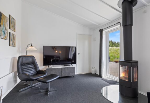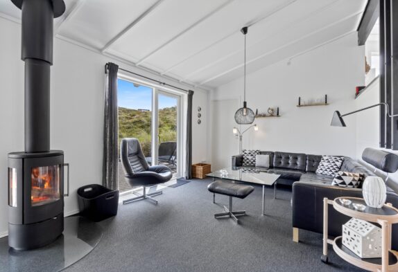 Stuen er hyggelig indrettet og med loft, der går op i kip. På de køligere dage kan man tænde op i brændeovnen og hygge sig med en god bog i sofaen, alt imens ”naturen næsten kommer ind i stuen”. Man har her en fantastisk udsigt mod syd, udover det storslåede klitlandskab.