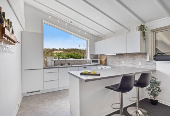 Huset her er spændende indrettet, og i forskudte plan. Der er åbent fra den velindrettede køkkenafdeling og ned til stuen, som ligger et par trin lavere. Køkkenafdelingen er bl.a. med 60 L. fryser, opvaskemaskine og mikroovn.