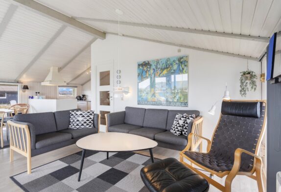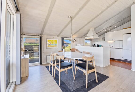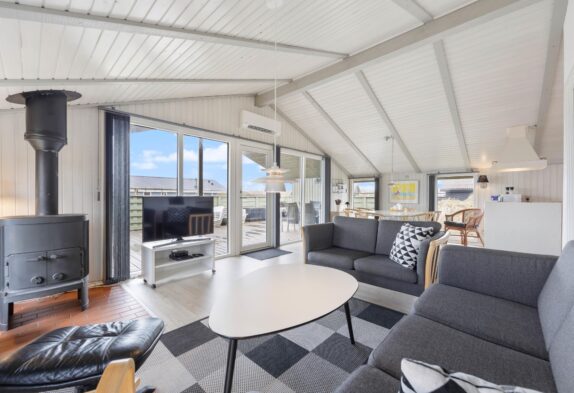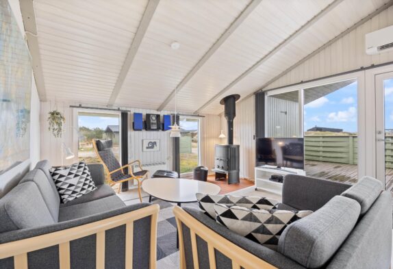 Den hyggelige stue har pæne og komfortable møbler, brændeovn og står i åben forbindelse med køkkenet. Stuen har vinduespartier fra gulv til loft, som skaber et godt lysindfald i rummet. Desuden har sommerhuset en energibesparende varmepumpe, som I kan benytte jer af.