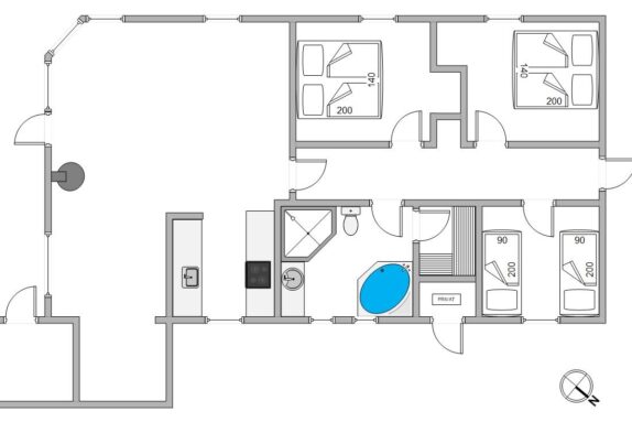 Det praktisk indrettede køkken med blandt andet opvaskemaskine, mikroovn og separat fryser står i åben forbindelse med stuen. Der er 3 soveværelser samt et stort badeværelse med gulvvarme, boblebad og sauna. Huset har brændeovn og en energibesparende varmepumpe, der også kan benyttes som aircondition om sommeren.