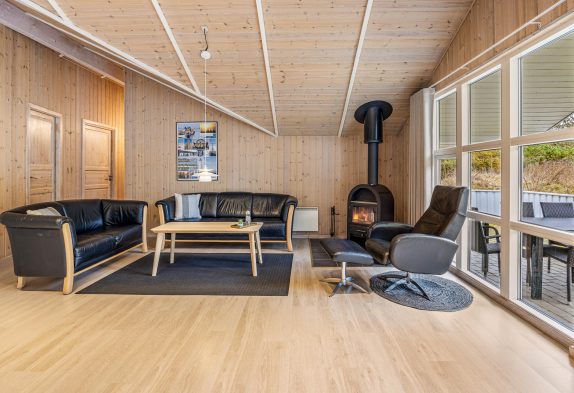 Stuens sofahjørne indbyder til totalafslapning – evt. med en god bog og kop kaffe foran den knitrende ild i brændeovnen.