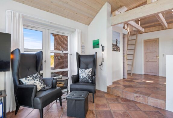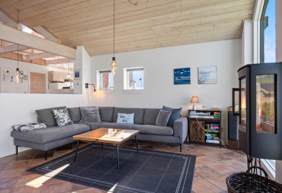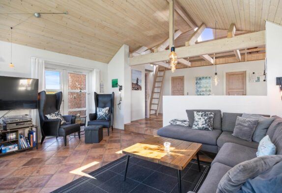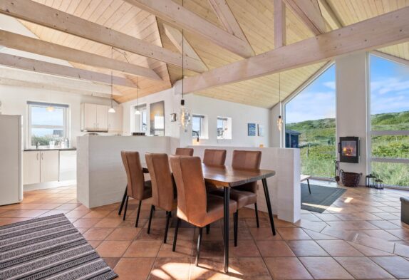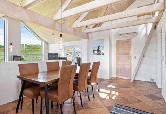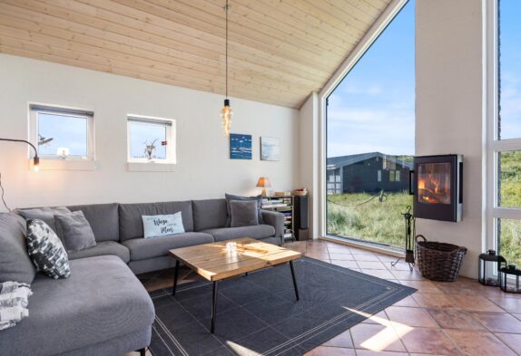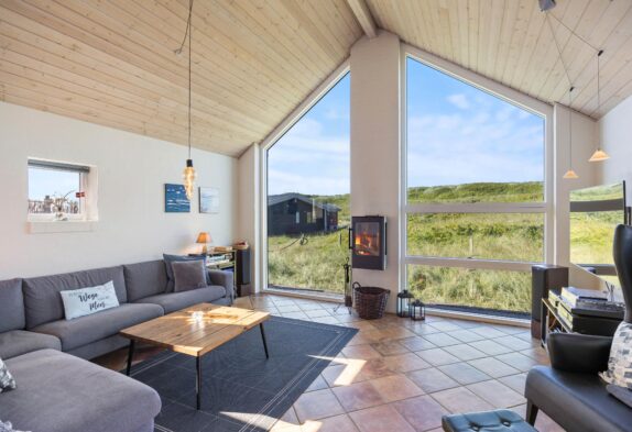 Ved den yderste klit på den jyske vestkyst, finder I dette flotte og spændende sommerhus. Feriehuset er til 6 feriegæster plus to kæledyr, velindrettet og har masser af komfort. Det praktisk indrettede køkken har alt i hårde hvidevarer og står i åben forbindelse med spisestuen. Herfra er der adgang til den nedsænkede stue, hvor de store vinduespartier giver et fantastisk lys og trækker klitterne med helt ind i stuen. I stuen er der også loft til kip, som får rummet til at føles større – over spisestuen gemmer sig også et ekstra rum, nemlig en hems.