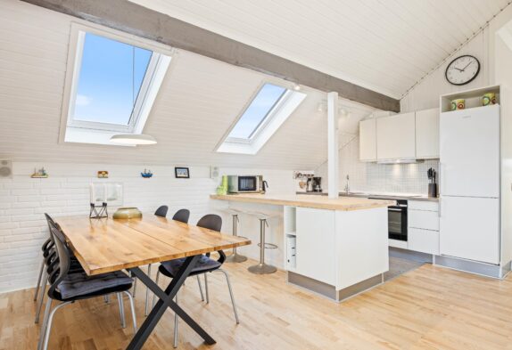Det smarte køkken byder på praktisk udstyr til at fremtrylle lækre retter til hele familien. Her er åbent til spiseplads, trægulve og en varmende brændeovn.