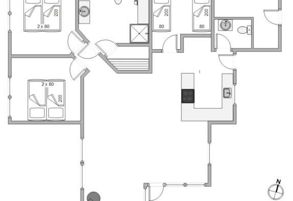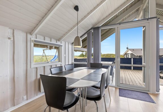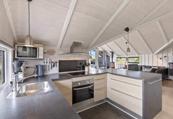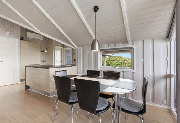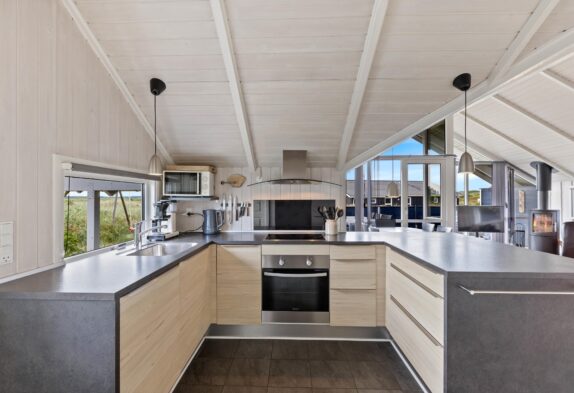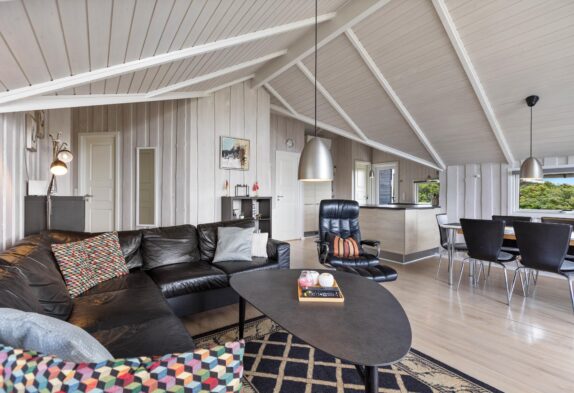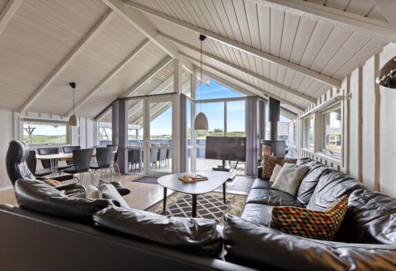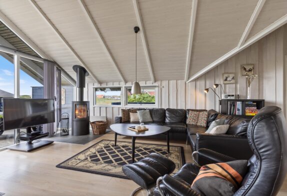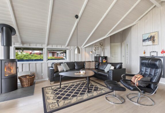 Feriehusets åbne opholdsrum er lyst og rummeligt med store vinduer, der lukker naturen helt ind. Her kan I nyde udsigten, læne jer tilbage i sofaen med en kop kaffe og bare holde ferie. Tænd op i brændeovnen på køligere dage, se en film sammen og nyd den klassiske sommerhusstemning. Som supplement kan feriehuset opvarmes med en energibesparende varmepumpe.