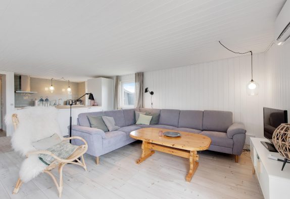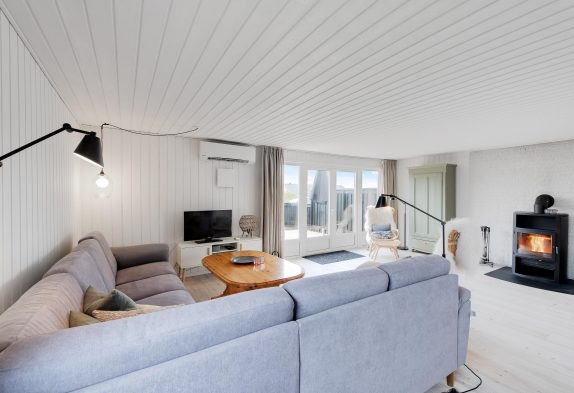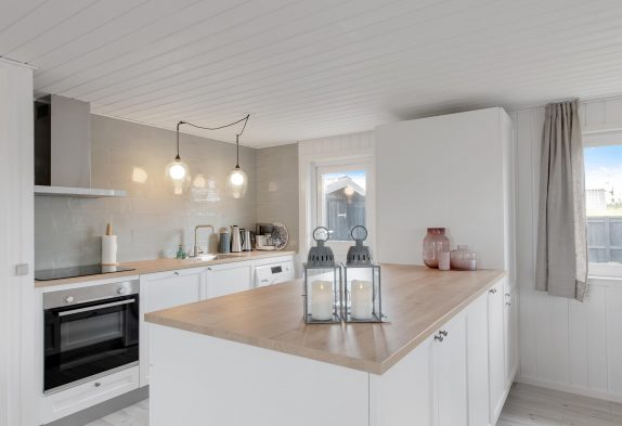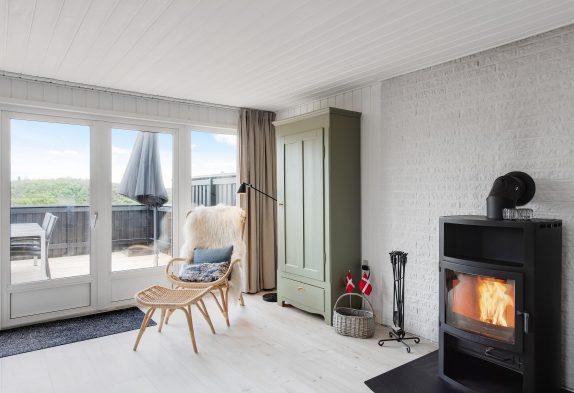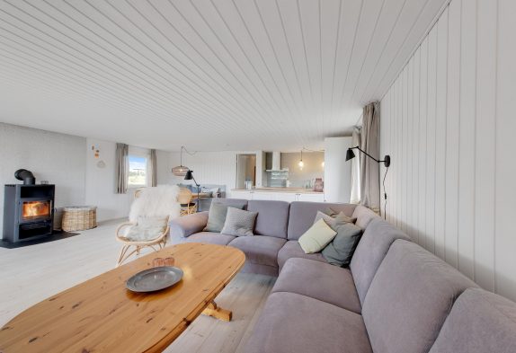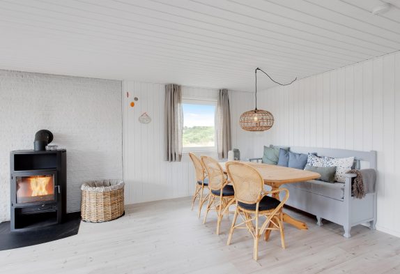 Husets hjerte er det åbne opholdsrum, hvor stue og køkken er slået sammen med brændeovnen som centrum. Det dejlige lyse køkken er holdt i bondehusstil der sammen med slagbænken og karlekammerskabet giver køkkenalrummet et skønt stemningsfyldt udtryk. Her vil der med garanti blive skabt et hav af nye ferieminder, og hele familien kan samles til lækre feriemåltider, hyggelige kortspil og afslapning på sofaen, mens brændeovnen knitrer i baggrunden.