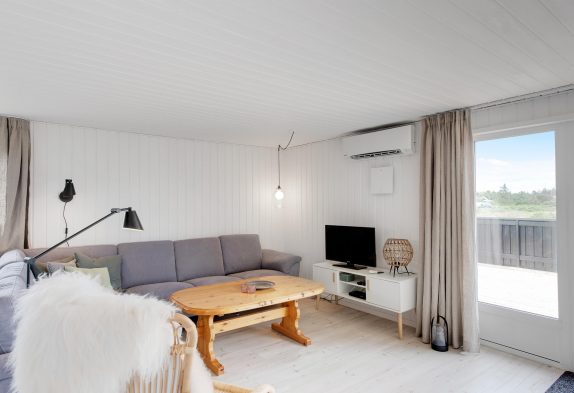 Fra stuen er der udgang til en afskærmet træterrasse, hvor I kan sidde og nyde det gode vejr og tanke nye kræfter i den friske havluft. Der er både sørget for havemøbler og liggestole, og til de lune sommeraftener; en grill.