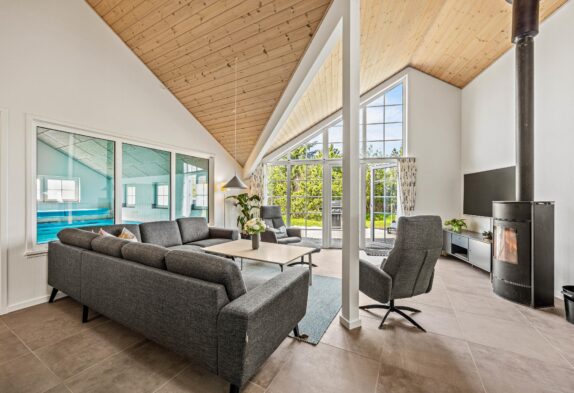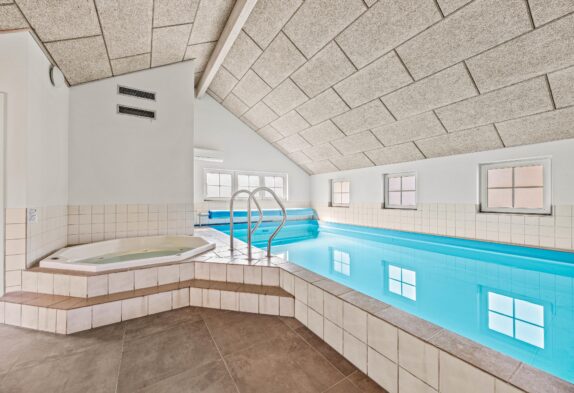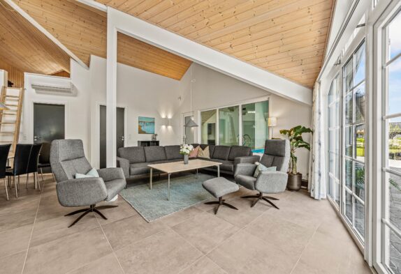 I hjertet af Blåvand, men stadig med en rolig beliggenhed, ligger dette store, flot renoverede sommerhus med egen swimmingpool. I de store, højloftede rum er der plads til jer alle, og dertil kommer saunaen og spabadet med plads til 6 personer samt aktivitetsrummet, hvor I kan spille billard, bordtennis eller shuffleboard eller hygge jer ved spillemaskinen. Uanset om I er til en aktiv eller afslappende ferie, er der noget for jer på Sønder-Vasevej 86.