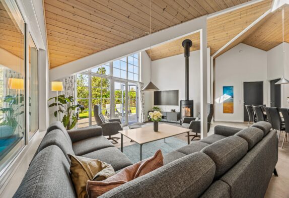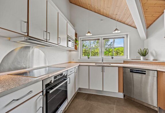 De store vinduespartier skaber et skønt lysindfald i køkken/alrummet med det imponerende loft, så her vil det selv på mørke vinterdage være en daglig glæde at samles omkring spisebordet og høre om hinandens ferieoplevelser over skøn feriemad.