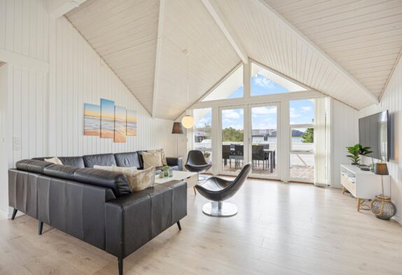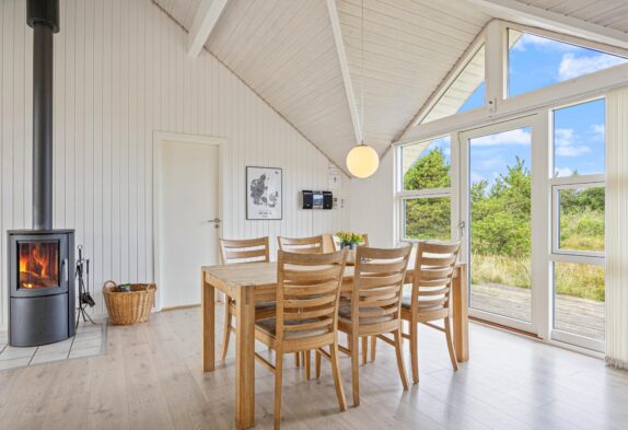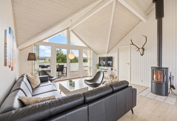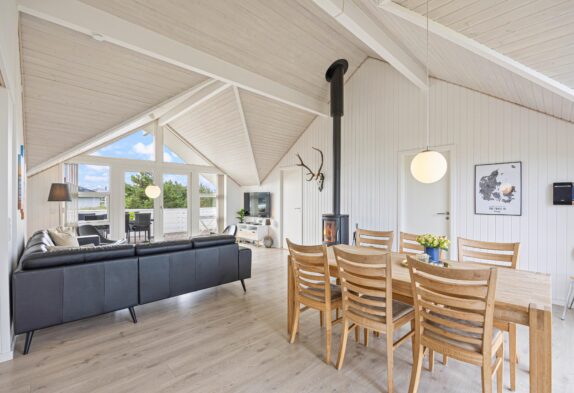 Et rummeligt rum med højt til loftet og et dejligt vinduesparti, hvorfra lyset vælter ind i. Centralt placeret er brændeovnen, der skaber en hyggelig stemning, og samtidig opdeler stuen og køkkenet. I køkkenet kan I sammen lave nogle skønne måltider, som senere skal nydes omkring spisebordet – efterfølgende klarer opvaskemaskinen det kedelige arbejde, mens I slapper af i sofaen. Stuen indbyder til mange hyggelige stunder. Lænestolen er perfekt til ferielæsningen, mens den store hjørnesofa inviterer jer alle til film- eller brætspilsaftner.