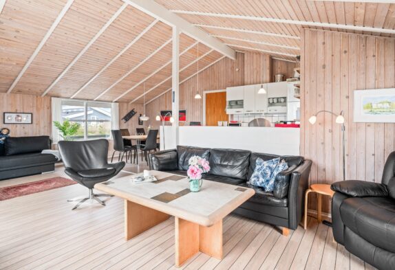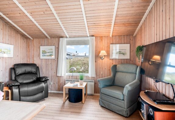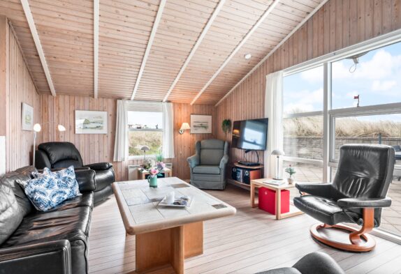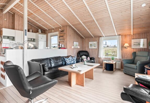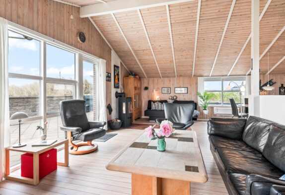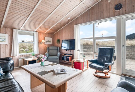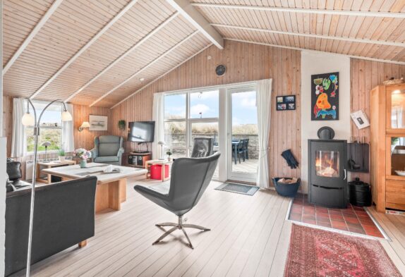 Fra feriehusets hyggelige stue er der udgang til en skøn sydvendt terrasse, som er naturligt afskærmet og lukket, så du uforstyrret kan nyde livet. Feriehuset har også en fin lille terrasse mod øst – perfekt til morgenkaffen og i ly for vestenvinden. Terrassen er udstyret med havemøbler, liggestole og grill. For de mindste er der opstillet gynge og sandkasse.