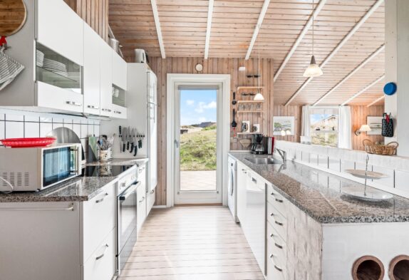 Sommerhuset har et lyst og pænt køkken med opvaskemaskine og mikroovn. Køkkenet står i åben forbindelse med stuen, som er rigtig hyggeligt indrettet med gode og komfortable møbler, brændeovn og fladskærm.