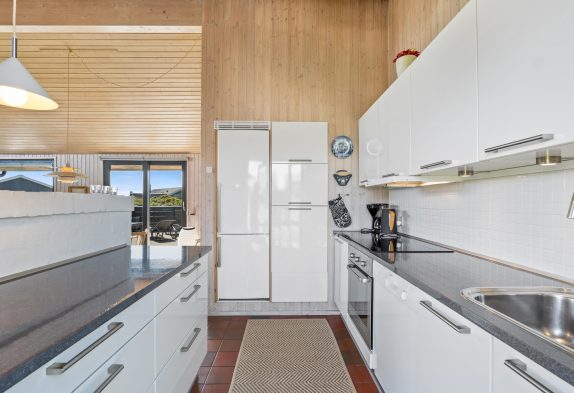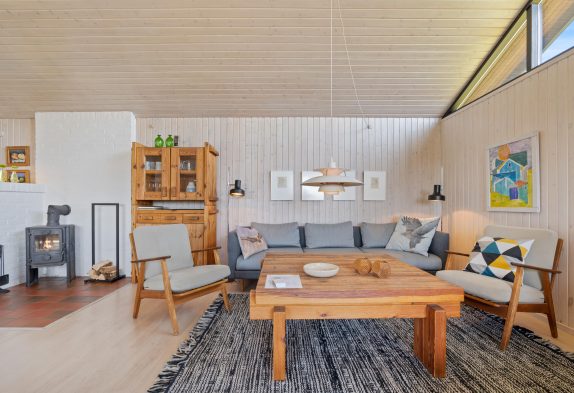 I sommerhuset bliver I mødt af en hyggelig indretning med loft til kip og vidunderligt lysindfald i alle rum. Det moderne køkken med alt i hvidevarer står i åben forbindelse med den store stue, som er indrettet med gedigne møbler i både spiseafdelingen og opholdsafsnittet, hvor der skal hygges foran den store brændeovn. Her findes både TV med parabol og radio med CD.