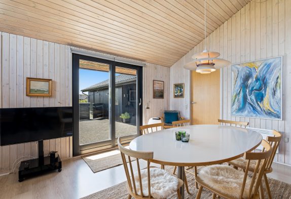 Hyggeligt sommerhus tæt på stranden er beliggende her på P Chr Dahls Vej 32. Sommerhuset har en pragtfuld lukket solgård og er ideelt til ferie med småbørn og/eller kæledyr. Sommerhuset har en charmerende indretning med bl.a. et ekstra opholdsrum med TV til f.eks. DVD eller spil.
