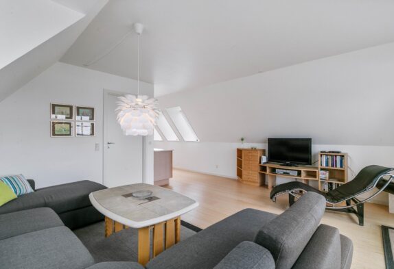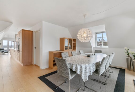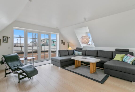 Den østvendte terrasse er åben og egner sig perfekt til både solbadning og grillmiddage. I kan tage plads på havemøblerne og kigge ud i det fjerne lidt fra oven, imens I nyder en kold drink. Den vestvendte terrasse er overdækket, og herfra kan I følge med i byens liv nede på gaden, men samtidig sidde i fred bag det mælkehvide glasrækværk.