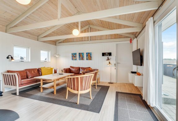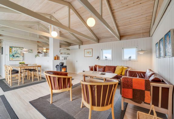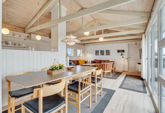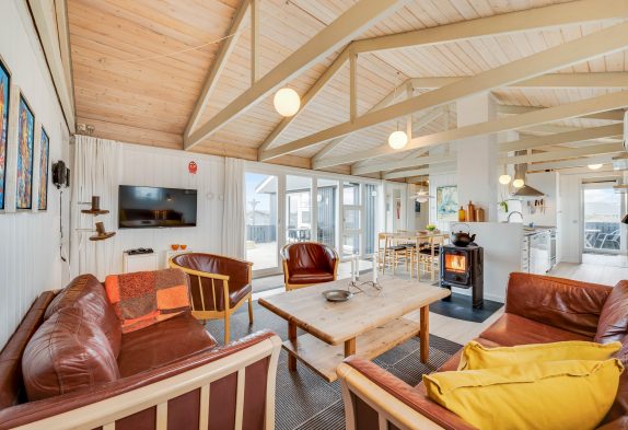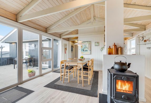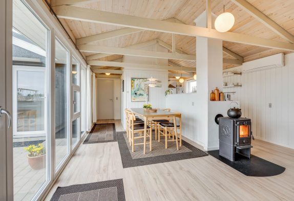 Sommerhusets køkken ligger i åben forbindelse med spiseplads og stuen. I stuen sikrer det hyggelige sofahjørne ved brændeovnen afslapning og hygge for hele familien. Feriehusets entré har rigeligt med plads til overtøj og sko efter hjemkomst fra en skøn gåtur ved stranden.