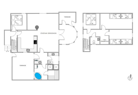 På 1. sal er der tre soverum og et gæstetoilet, mens badeværelset med gulvvarme og det fjerde soverum befinder sig i stueetagen.