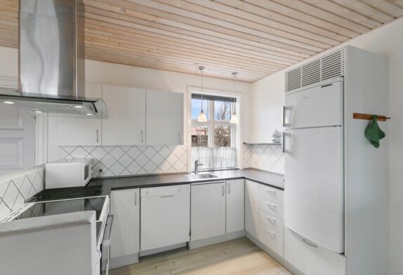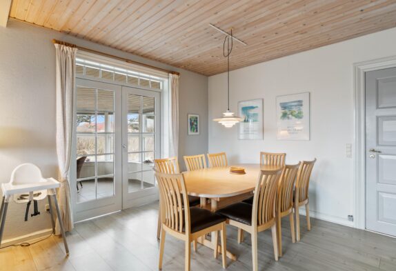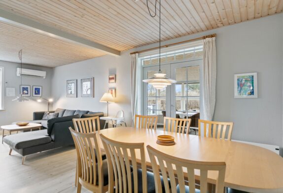 I det store opholdsrum i stueetagen kan hele familiens samles til lækre feriemiddage og brætspilsaftner om spisebordet. Opvaskemaskinen rydder hurtigt op efter madlavningen. Gennem vinduerne i den afrundede havestue kommer der masser af lys ind i huset, og I kan i al slags vejr sidde og nyde udsigten til himlen og den grønne sommerhusgrund.