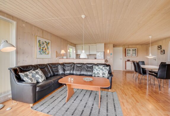 Køkkenet ligger i åben forbindelse med stuen og er praktisk udstyret med opvaskemaskine og mikrobølgeovn. Stuen er pænt møbleret med en komfortabel sofa og en lille hyggekrog i karnappen mod syd. Her er gratis trådløst internet samt varmetilskud i form af solvarme.
