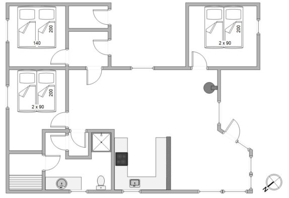 Sommerhuset, der er renoveret i 2018, har 3 fine soveværelser, som alle er indrettet med komfortable dobbeltsenge. Badeværelset er udstyret med gulvvarme, og her er også rig mulighed for afslapning og velvære efter en lang gåtur ved vandet – Sommerhuset har nemlig en sauna.