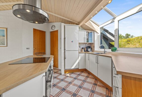 Straks I kommer ind i feriehuset, kommer I ind i husets hjerterum med køkkenet, som blev renoveret i 2024 og den stilfulde spisestue ved det dejligt store vinduesparti. Her kan I hygge med kokken og køkkenhjælpere, spille et spil og naturligvis nyde en dejlig middag.