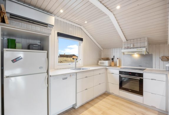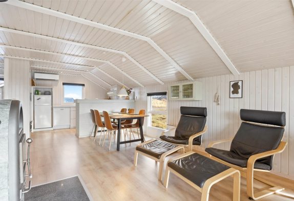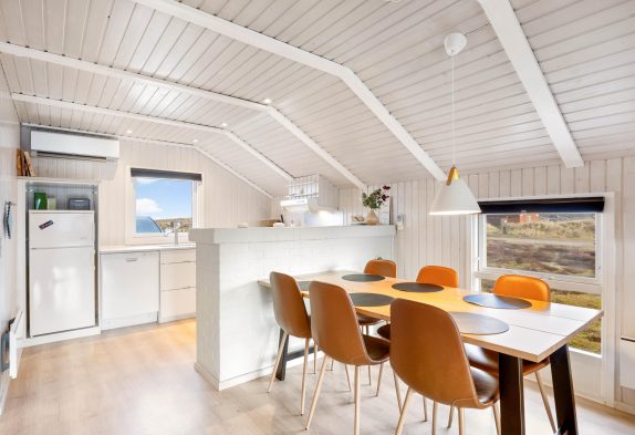 Hele sommerhuset er lyst og praktisk indrettet, dejligt og hyggeligt. Det lyse træ og de mange vinduer giver sommerhuset en luftig atmosfære. Glæd dig til familietid med den ene eller den anden spilleaften ved en knitrende pejs, se film sammen eller arranger en hyggelig madlavningsaften. Den funktionelle køkkenafdelingen er i åben forbindelse med stue- og opholdsrummet.