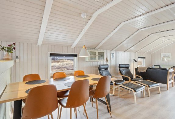Der er plads til 6 personer fordelt på 3 soverum, hvoraf de to er med dobbeltsenge, og et værelse er med 2 køjesenge. Badeværelset har alt, hvad I har brug for, bl.a. en vaskemaskine, som gør feriepakningen let. Der finder I også en sauna, hvor I rigtig kan blive gennemvarmet – måske efter en lang dag i klitlandskabet og ved stranden.