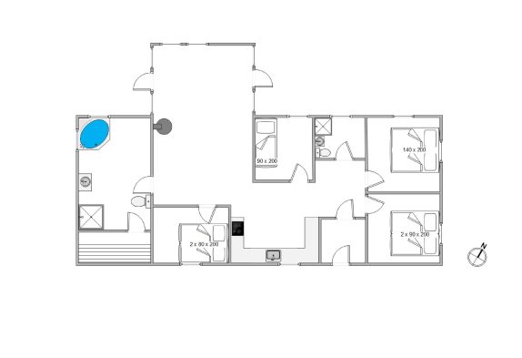 Det dejlige feriehus ligger på en 2000 m2 stor sommerhusgrund og råder over 2 badeværelser med gulvvarme og 4 soveværelser.