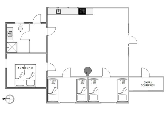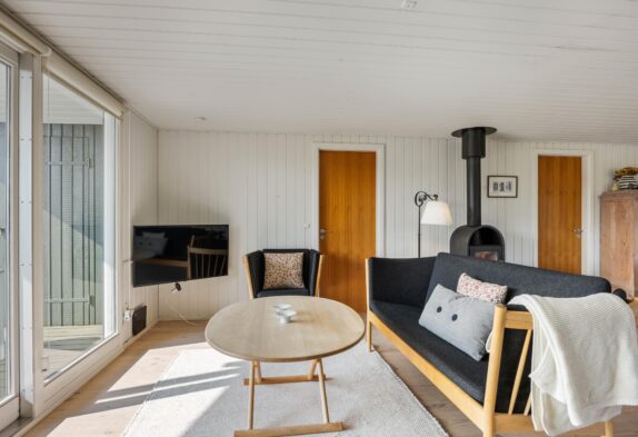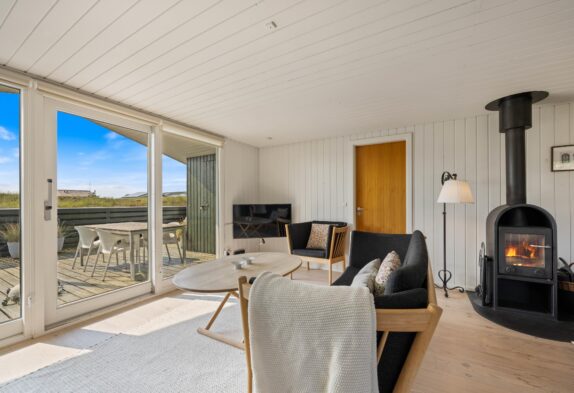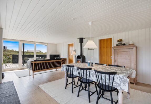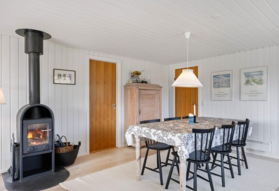 Det åbne køkkenalrum rummer både et langt spisebord, et sofaområde og det flotte køkken med masser af plads til fælles madlavning. På kølige dage kan I tænde op i brændeovnen og sætte jer tilrette med en spændende bog i den dejlig varme ferieatmosfære.