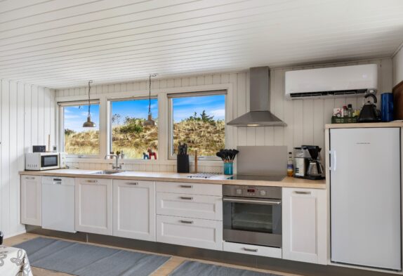 Den delvist overdækkede terrasse lader jer nyde den friske luft i regnvejr, og på grund af de omkringliggende klitter er sommerhusgrunden forholdsvist afskærmet og privat. Imens I nyder en lækker grillmiddag udendørs, klarer vaskemaskinen tøjvasken, og opvasken er hurtig overstået med hjælp fra opvaskemaskinen.