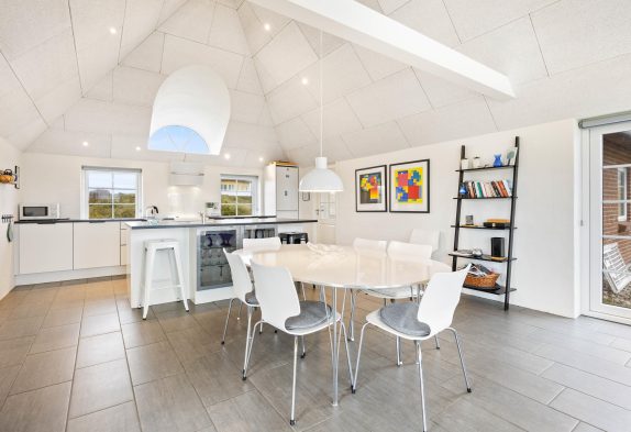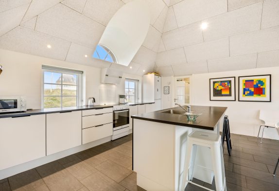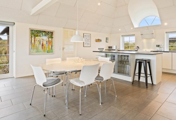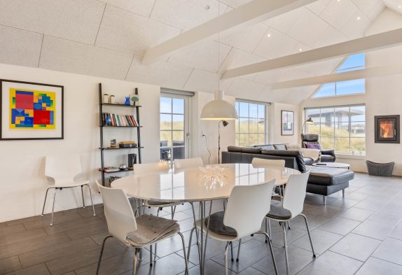 I det stråtækte sommerhus i Søndervig er rammerne sat for en ferie i ekstraordinære omgivelser. Med højt til loftet, store vinduer og lyse farver er der gjort meget for, at I skal føle jer godt tilpas, og den moderne og stilfulde indretning vil alles smag. Et af sommerhusets highlights finder I på det største af 2 badeværelser – det er nemlig indrettet med både sauna og spabad, så I kan forkæle jer selv lidt ekstra på ferien. I varmen kan I tanke ny energi langt væk fra den travle hverdag.