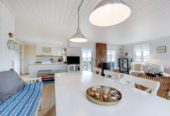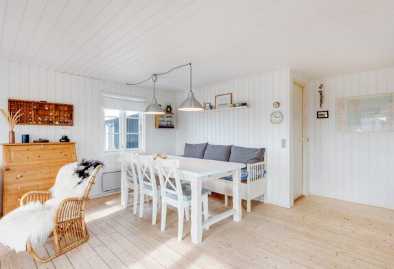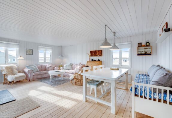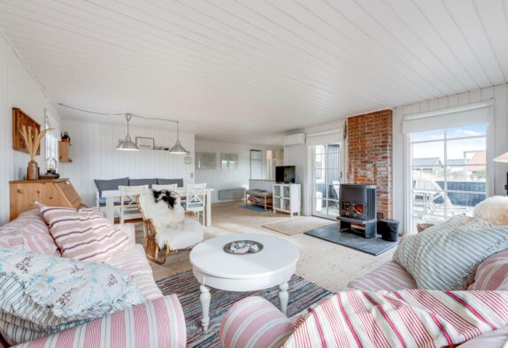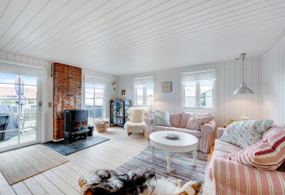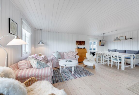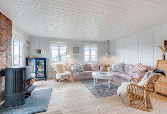 Stuen er indrettet i nordisk stil med kludetæpper, flotte trægulve og bløde sofaer. Rigtig hyggeligt – og oplagt til indendørs hygge – måske med familiespil eller en god bog foran brændeovnen. Her kan man kun føle sig hjemme.