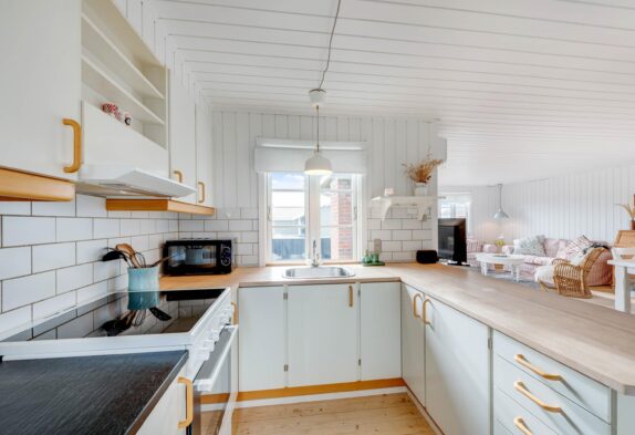 Et virkelig charmerende sommerhus, indrettet i ”rigtig” sommerhus-stil med personlighed og sans for detaljer – perfekt til 4 personer. Huset er hyggeligt og praktisk indrettet med bl.a. kombineret spisestue -opholdsrum – med en praktisk køkkenafdeling. Den åbne og veludrustede køkkenafdeling er bl.a. med 40 l. fryser og mikroovn. Opvaskemaskinen står i bryggerset.