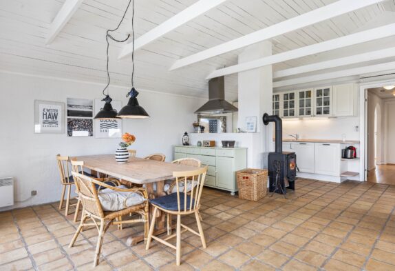 Et super dejligt hus med plads til alle. Det store opholdsrum med køkken og stueafdeling er husets hjerte og naturlige samlingspunkt. Her inviterer de mange store vinduer den smukke og altid vekslende natur helt ind i stuen.   Den velindrettede køkkenafdeling med bl.a. mikroovn og opvaskemaskine gør husarbejdet til en leg, samtidigt med at man kan følge med i samtalen i stuen.
