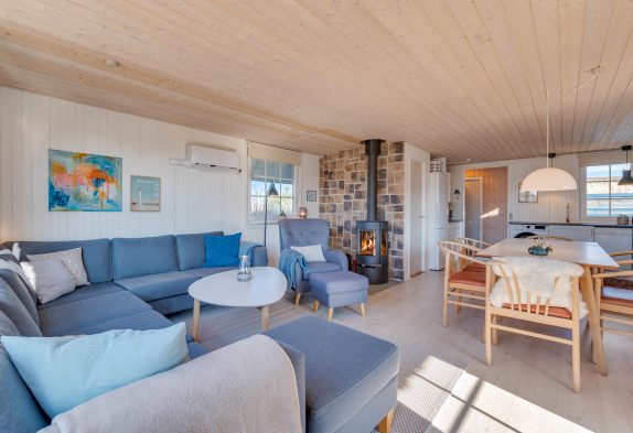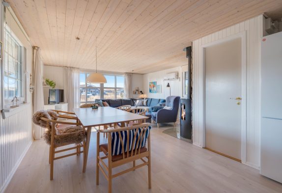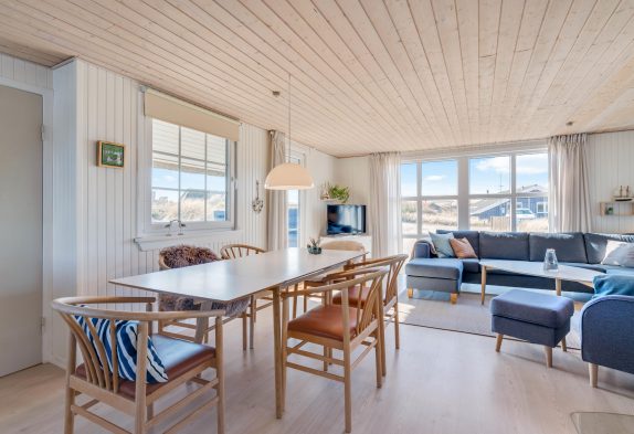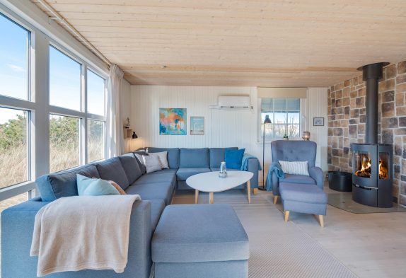 Stuen indbyder til dejligt afslappende samvær og en måske en afslappende stund med en god kop kaffe foran brændeovnen på de lidt koldere dage. Igennem de store vinduespartier har I en storslået udsigt udover det fascinerende klit-landskab. Her kan I også på de køligere dage nyde naturen.
