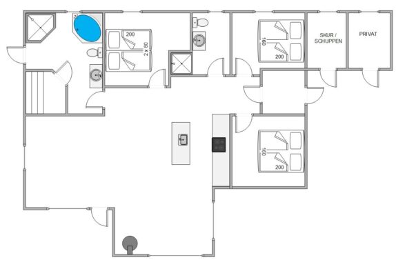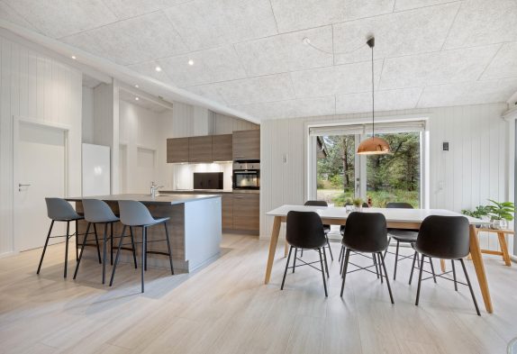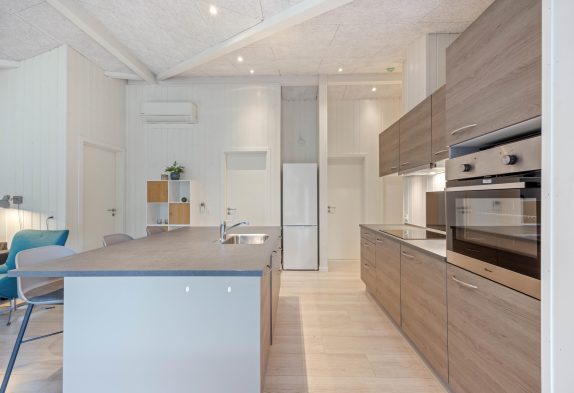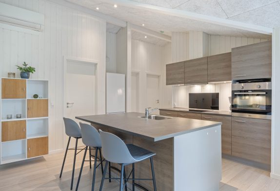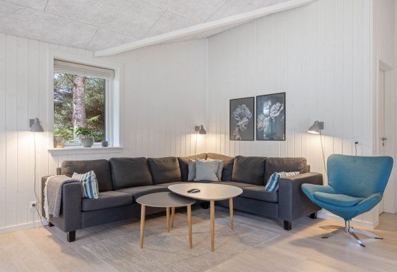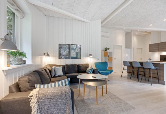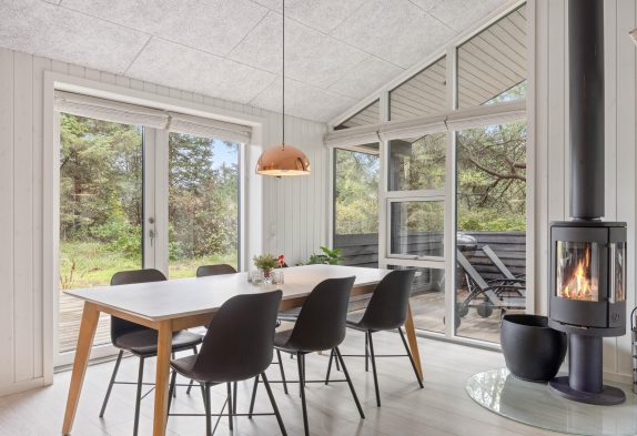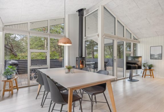 Her er lagt vægt på den gode og hyggelige indretning og kvalitetsmaterialer. Det store opholdsrum, med en veludrustet køkkenafdeling, spiseplads og sofahjørne, er husets hjerte, hvor der er plads til alle. Det indbyder til familiehygge med spil og afslapning foran den knitrende ild i brændeovnen.