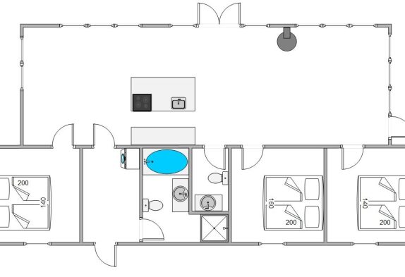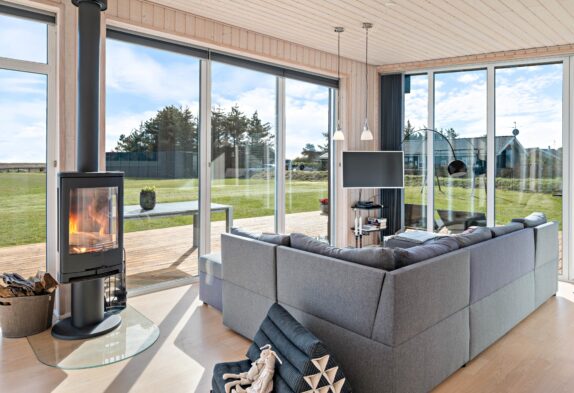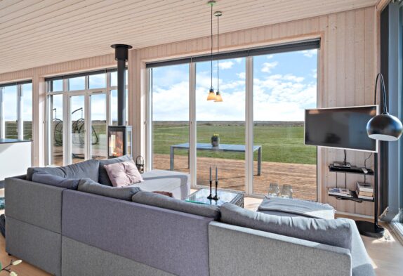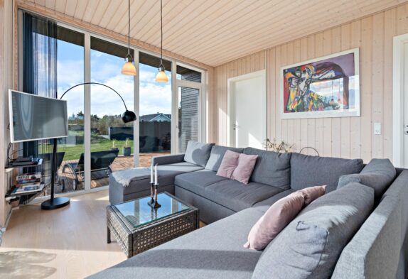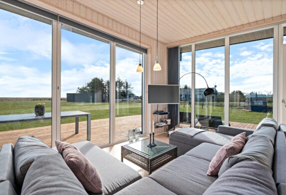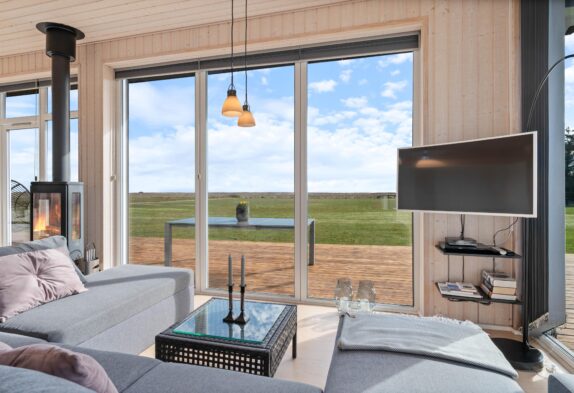 Sommerhuset her er nyt, lyst og praktisk indrettet. Opholdsrummet, som er hjertet i feriehuset og det naturlige samlingspunkt, byder jer velkommen med de store panoramavinduer på de 3 af sommerhusets sider. På den måde får man, også på de koldere dage, naturen helt ind i stuen.