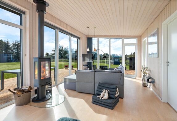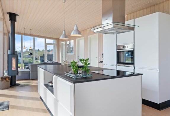 Her er lyst og hyggeligt – den veludrustede køkkenafdeling befinder sig i midten af rummet og her finder I selvfølgelig både mikroovn og opvaskemaskine. På de køligere dage kan man slappe af i sofaen foran brændeovnen med den knitrende varmende ild, måske med en god bog og en kop kaffe.