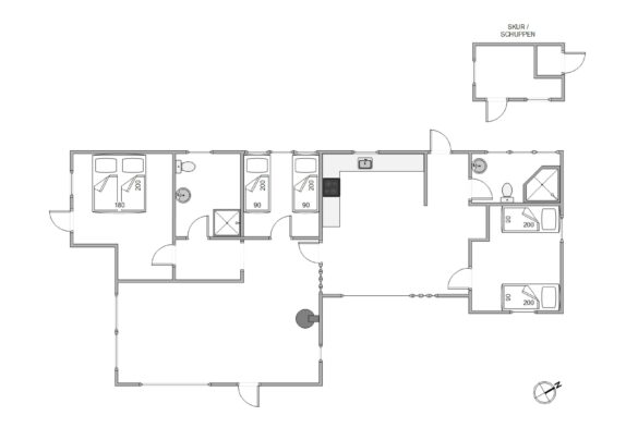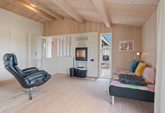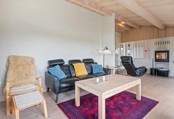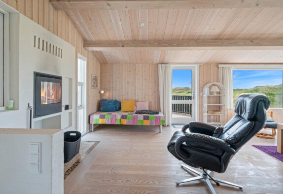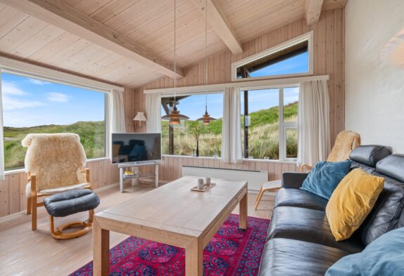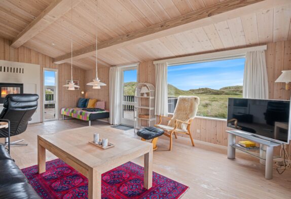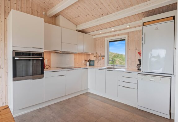 Det store køkken er perfekt til madlavningen til den sultne flok efter en dag med masser af frisk luft. Dertil kan I fra spisebordet nyde en skøn udsigt ud over området. Stuen er perfekt til hygge, om dagen med udsigt til klitlandskaben gennem de store vinduer, om aftenen med ild i kaminen. Hvis I undervejs på ferien skulle få brug for at få vasket lidt tøj, er feriehuset udstyret med en lille topbetjent vaskemaskine. For at sikre et godt indeklima i sommerhuset, er huset også udstyret med en luft-til-luft varmepumpe, der sikrer en billig og god opvarmning af sommerhuset.