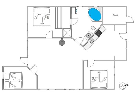 De 3 lyse soverum giver god plads til hele familien. Der er 2 dobbeltsenge på 180×200 centimeter, mens den sidste seng er 140×200 centimeter. Badeværelset er lækkert med gulvvarme, sauna og spa, og her kan I tilbringe nogle afslappende stunder.