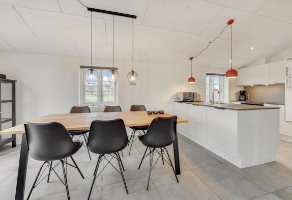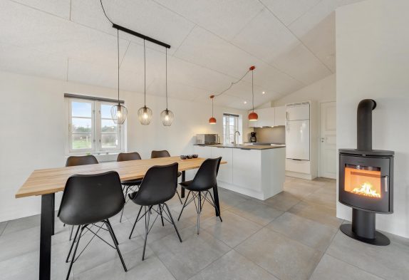 Oplev hygge og komfort i dette smukke stråtækte sommerhus, hvor varme fra brændeovnen og et blødt, varmt lys skaber den perfekte stemning. Slap af i den store, bekvemme sofa med din iPad, eller saml familien omkring det smukke plankebord og nyd et fælles måltid. I dette åbne rum, hvor stue og køkken smelter sammen, er der optimale betingelser for fællesskab og hygge.
