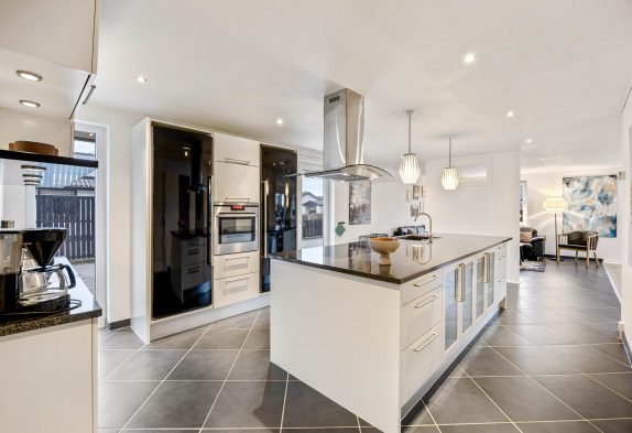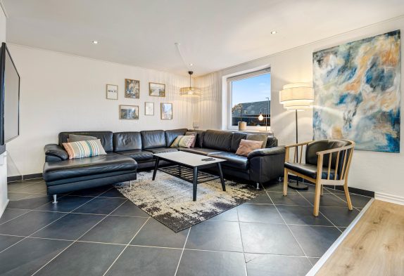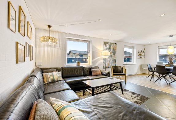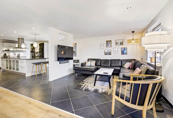 Opholdsstuen er lys og indbydende, og på de lidt køligere dage, kan man lade sig dumpe ned i sofaen med en kop kaffe og en god bog.