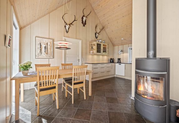 Det største wow vil du sikkert opleve, når du træder ind i husets hjerte – dets opholdsrum med stue, køkken og den store spiseplads. Her kan hele familien føle sig veltilpas, lave mad og spise sammen eller bare slappe af. Indretningen er gennemført stilfuld, bekvem og hyggelig – sæt jer til rette i de bekvemme lænestole eller den store sofa og bare nyd udsigten over eng, hede og skoven gennem det store panoramavindue – og få chancen for at se både rådyr-, krondyr, ræv og store rovfugle på nært hold.