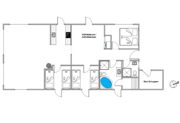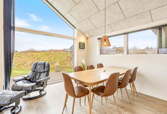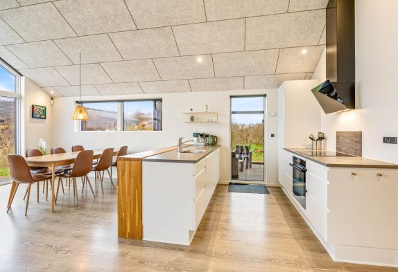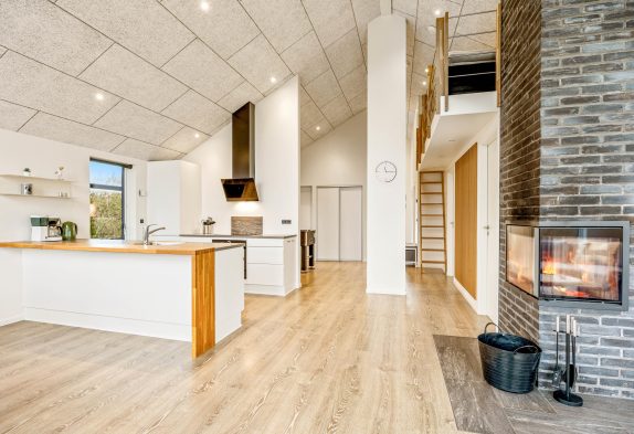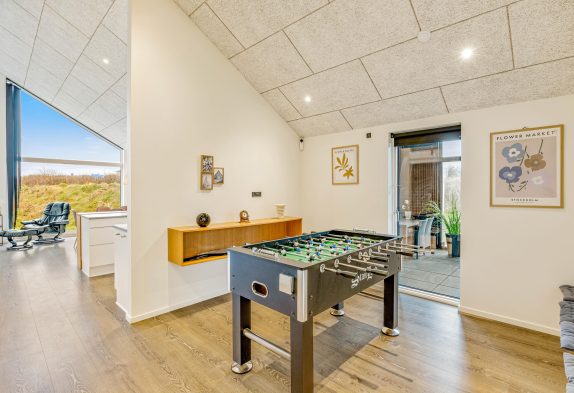 Sommerhusets hjerte er opholdsrummet, som ligger i åben forbindelse med både køkken og spiseafdeling. Her kan I tilbringe et hav af hyggelige feriestunder med fælles madlavning, lækre feriemåltider og afslapning på sofaen, mens brændeovnen knitrer i baggrunden. I forbindelse med opholdsrummet ligger desuden aktivitetsrummet, hvor de konkurrenceglade gæster rigtig kan få lov at boltre sig og konkurrere i en omgang bordfodbold.