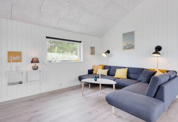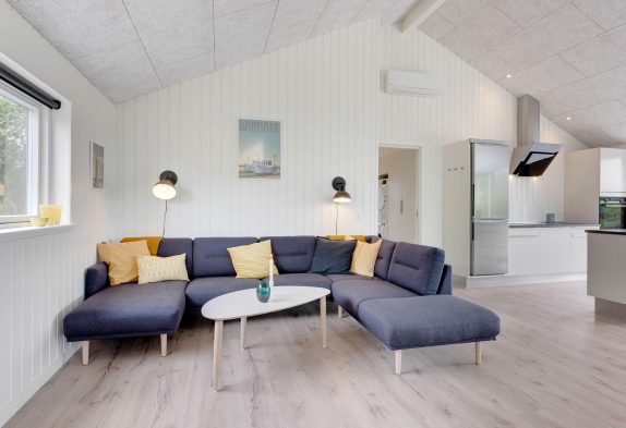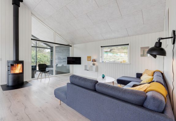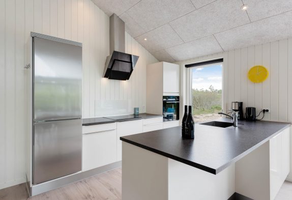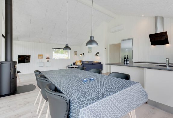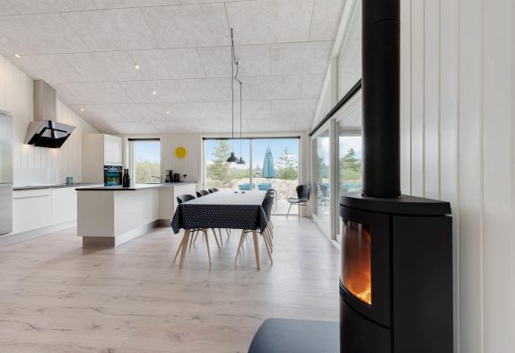 Feriehuset er opført i flotte kvalitetsmaterialer og er praktisk og flot indrettet. Det store opholdsrum med køkken- og spiseafdeling er sommerhusets hjerte og naturlige samlingspunkt. Køkkenafdelingen er flot og velindrettet med bl.a. opvaskemaskine, og herfra har I et godt overblik over rummet og ud over området igennem de store sydvendte panoramavinduer.