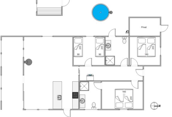De 2 praktiske og flotte badeværelser byder på masser af velvære – og gør sommerhuset optimalt til flere familier, der gerne vil holde ferie sammen. Fra badeværelset mod vest er der udgang til den vestvendte terrasse, hvor I finder både en lækker udesauna og en udebruser (kan bruges fra april til november). Der kan I hurtigt lade jer afkøle – og være klar til en tur i saunaen igen.