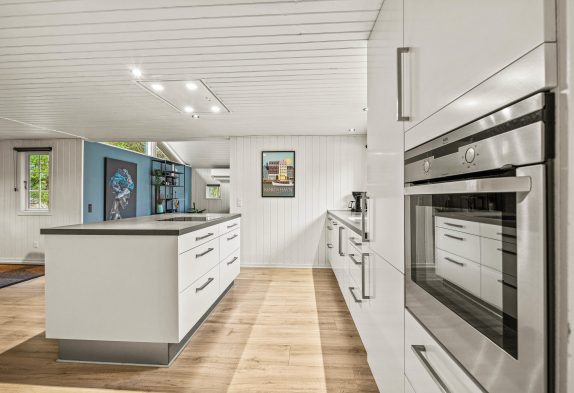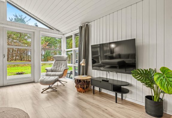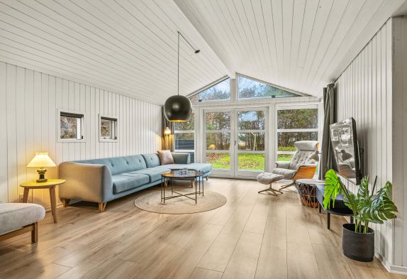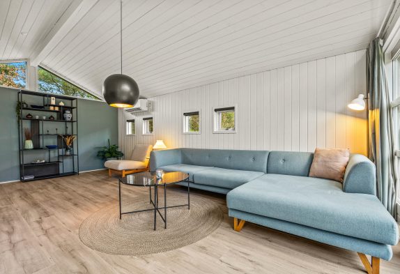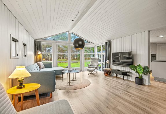 Det er nemt at se, at sommerhuset i 2020 har gennemgået en renovering. Det store opholdsrum, der forbinder stue, spiseafdeling og køkken i ét stort rum, fungerer som husets hjerte og byder på et godt miks mellem moderne og hyggelig indretningsstil. Her finder I desuden den klassiske brændeovn, som spreder varme og god stemning på hver en feriedag.